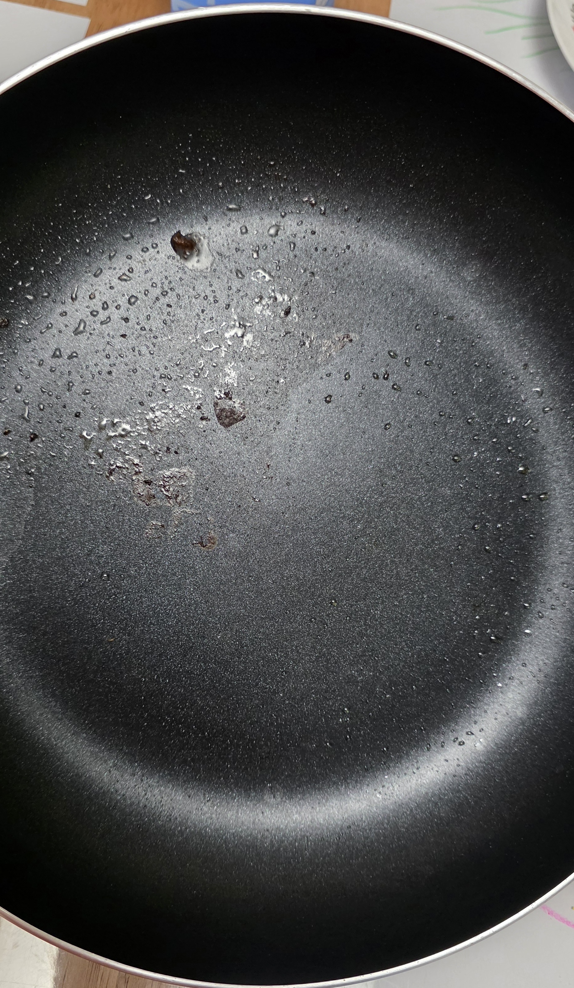 고기 구워먹은 후라이팬. 기름이 덕지덕지 붙어있다😭