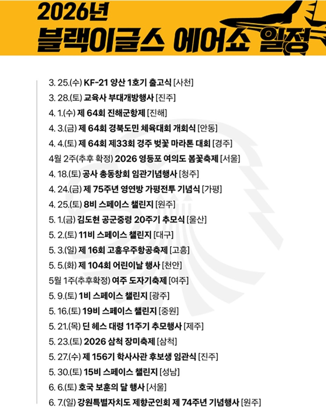 📅 2026년 블랙이글스 에어쇼 일정 (상반기)